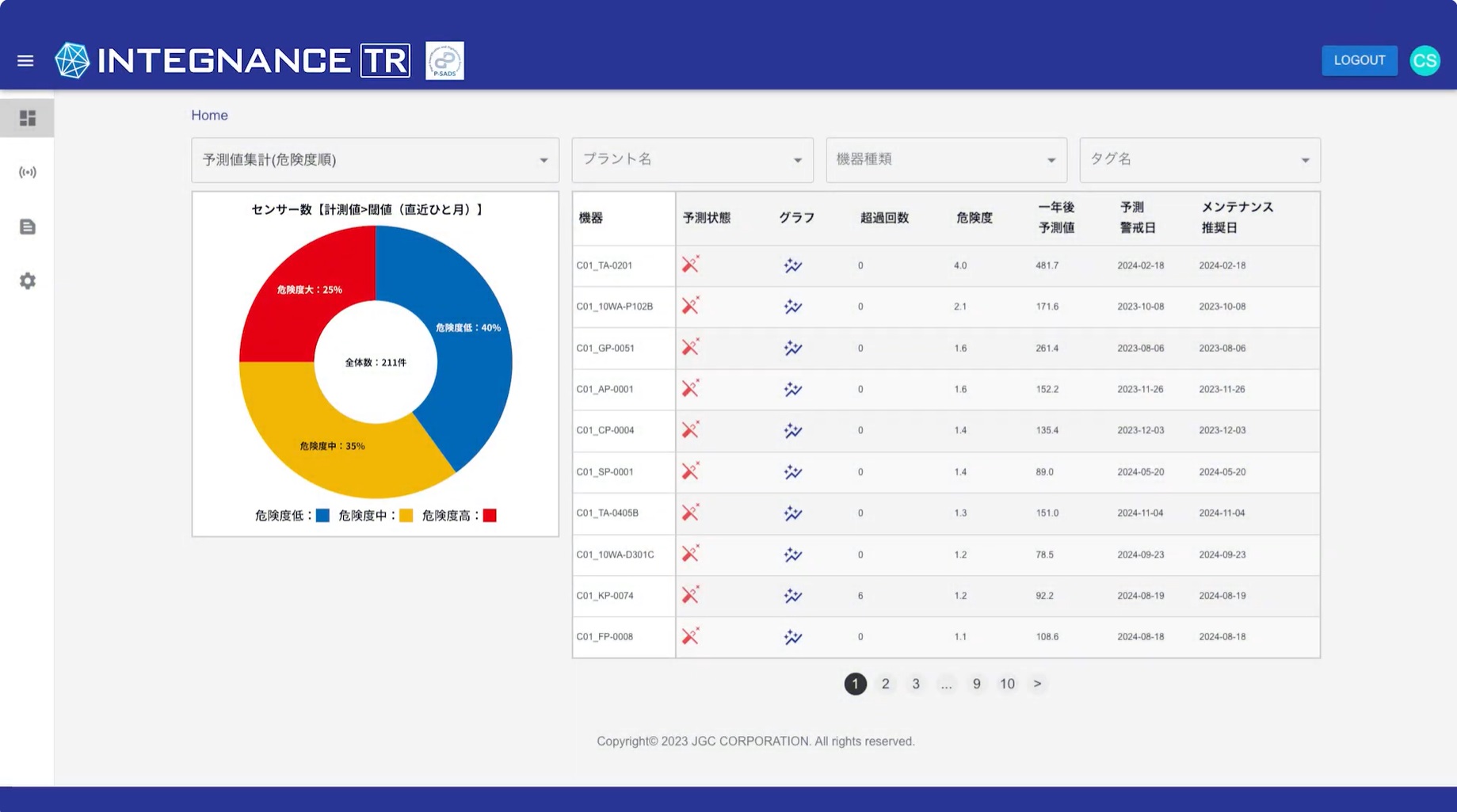 INTEGNANCE TR addresses key challenges in plant operations—uncertain failure occurence timing, inconsistent sensor data formats, high downtime due to reactive maintenance and so on by leveraging AI-based failure prediction and centralized data management.